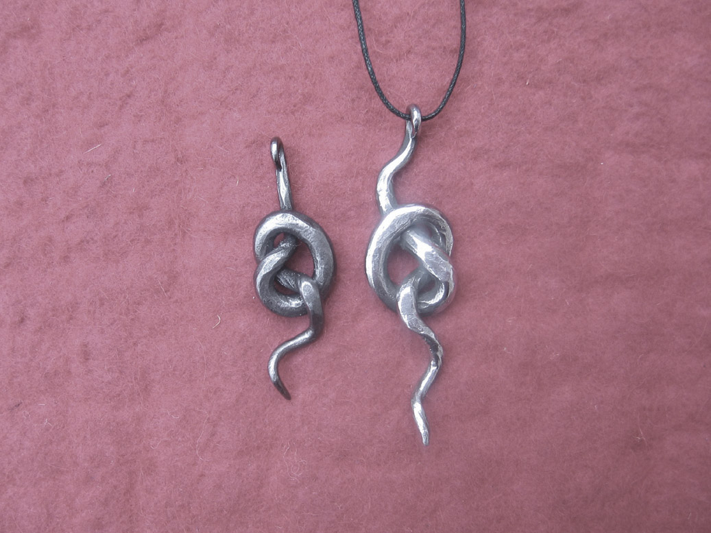 Kovaný závěs uzel, vlevo černá ocel, vpravo nerez, (možno kombinovat s náušnicemi S19)